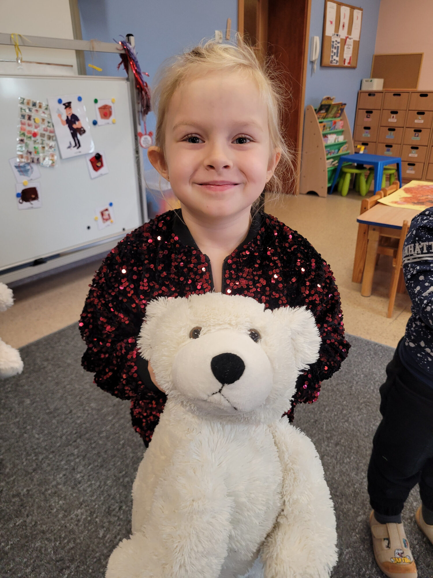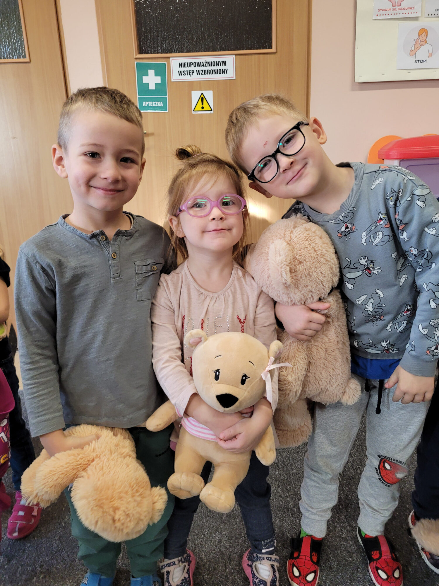 Proszę państwa, oto miś. Miś jest bardzo grzeczny dziś, Chętnie państwu łapę poda. Nie chce podać? A to szkoda.